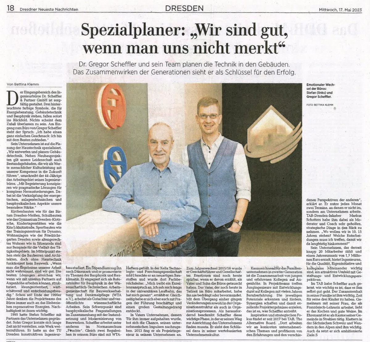 1995 hatte Stefan Scheffler mit Partnern das Unternehmen gegründet. Sohn Gregor konnte sich lange Zeit nicht vorstellen, sein Werk weiterzuführen. Er hatte an der Technischen Universität Dresden konstruktiven Ingenieurbau studiert. Ein Stipendium zog ihn nach Dänemark und er promovierte zu Themen der Bauphysik und Bauklimatik. Er engagiert sich als Referatsleiter für Bauphysik in der Wissenschaftlich-Technischen Arbeitsgemeinschaft für Bauwerkserhaltung und Denkmalpflege (WTA e.V.), arbeitet als Gutachter und veröffentlichte wissenschaftliche Arbeiten. Sein Schwerpunkt sind bauphysikalische Fragestellungen im Zusammenhang mit der Instandsetzung und Modernisierung von Bauwerken. Scheffler arbeitet unter anderen im Normausschuss „Feuchte". Gleich zwei Regalreihen in seinem Büro sind mit WTA-Heftern gefüllt.
