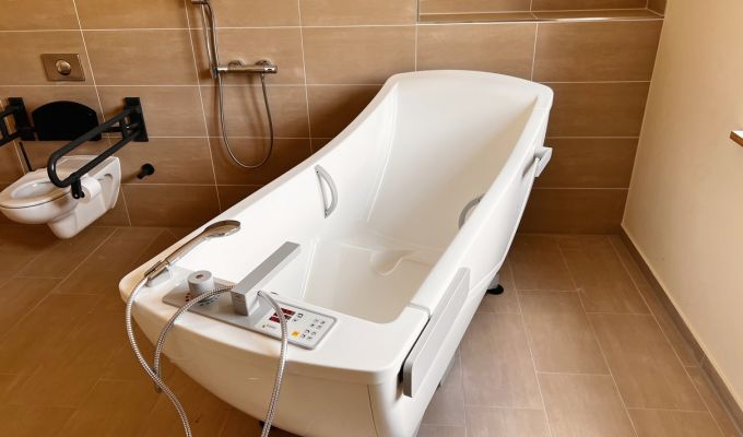 Eine Besonderheit stellt die Ausstattung des neu eingerichteten Pflegebades dar. Neben einem geräumigen, rollstuhlbefahrbaren Duschbereich, einem Behinderten-WC und einem unterfahrbaren Behindertenwaschtisch, wurde das Bad mit einer Pflegewanne ausge-stattet. Dabei handelt es sich um eine Sitz- und Liegebadewanne mit Höhenverstellung, Liegefunktion, seitlichen Einstieg und weiteren Wohlfühl-Funktionen wie Sound-System, Luftperl-, Aroma- und Farblichtsystem.