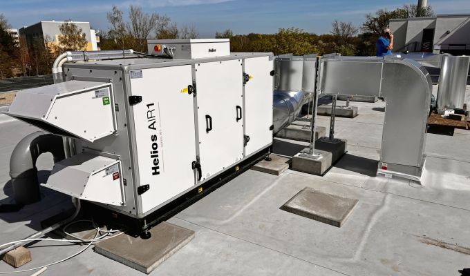 Die Belüftung der Gemeinschaftsräume und des Saales erfolgt über Lüftungsanlagen mit Wärmerückgewinnung. Die übrigen Räume werden über freie Lüftung sowie feuchtegeregelte Abluftanlagen mit Nachströmung be- und entlüftet.