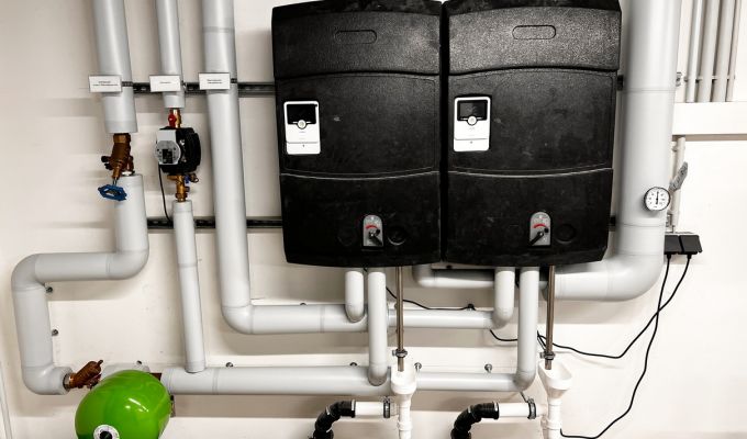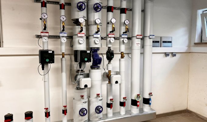 Die Wärmeversorgung erfolgt über zwei Pelletbrennwertkessel mit einer Gesamtleistung von 128 kW. Die erzeugte Wärme wird zur Sicherstellung eines effizienten Anlagenbetriebs in vier Pufferspeichern mit jeweils 1.000 Litern Volumen gespeichert und bedarfsgerecht an die Heizungs- und Warmwasserkreise verteilt. Die Trinkwassererwärmung erfolgt über eine kaskadierte Frischwasserstation. Ergänzend zu den sanitären Einrichtungen in den Bewohnerzimmern sind drei Pflegebäder vorgesehen.