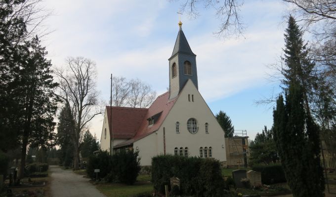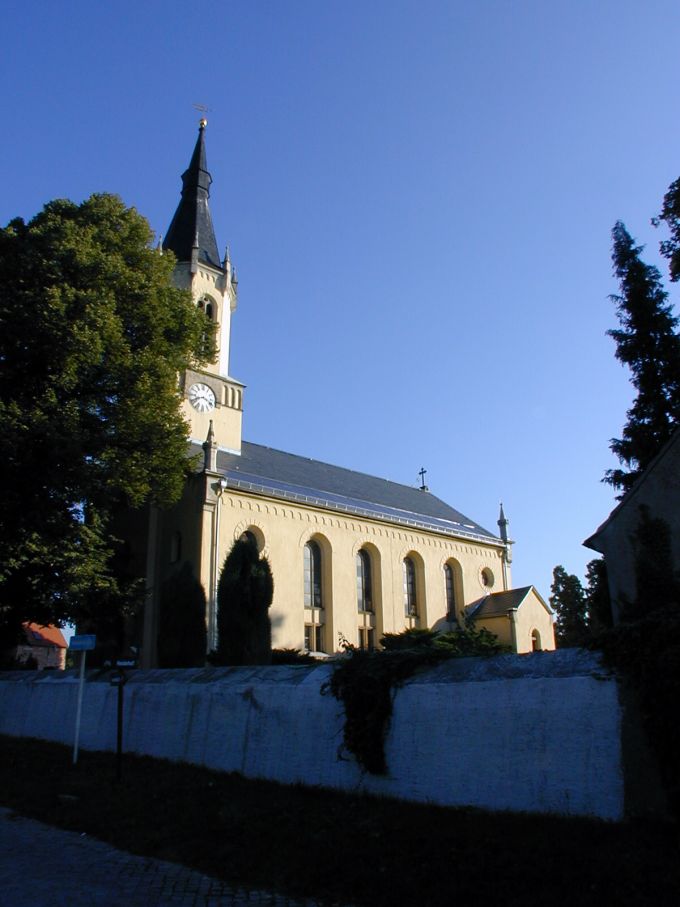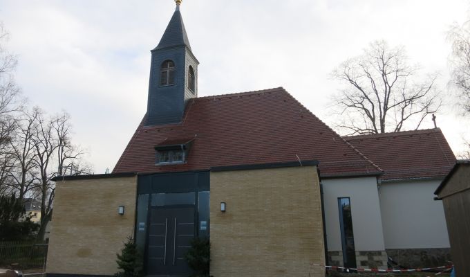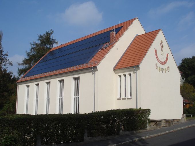 Bauherr: Ev.-Luth. Kirchgemeinde Frieden und Hoffnung Dresden-LöbtauKomplette Außensanierung der unter Denkmalschutz stehenden Dorfkirche in der Nähe von Moritzburg. In das naturschiefergedeckte Kirchendach wurde auf der Südseite eine Photovoltaik-Anlage integriert.