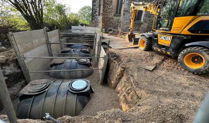 Die Regenentwässerung des Kirchendaches wurde an eine Zisterne zur Versorgung der Friedhofsbewässerung angeschlossen.