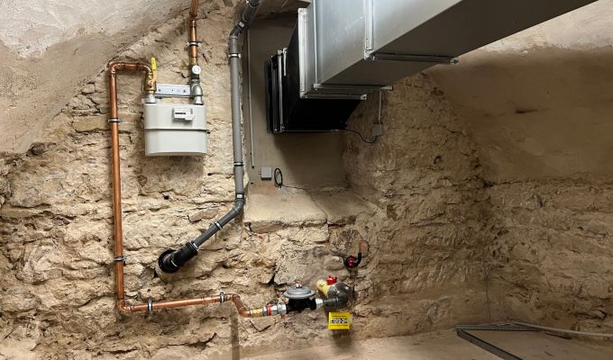 Im Zuge der kompletten Erneuerung wurde für Heizungsanlage eine Warmluftheizung mit zentralem Warmlufterzeuger unter teilweiser Nutzung vorhandener Luftkanäle installiert.