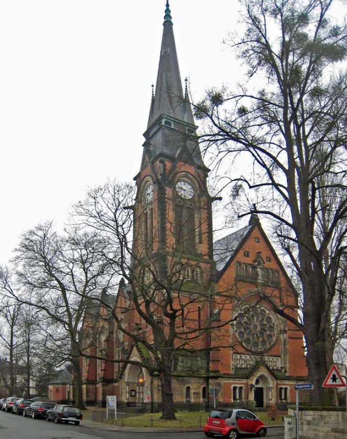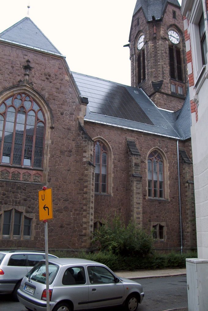 Auf der Südseite der Lutherkirche wurde auf einer Dachfläche von 85 m2 eine Solarstromanlage bestehend aus monokristallinen Glas-Folie-Modulen in die naturschiefergedeckte Dachhaut integriert.