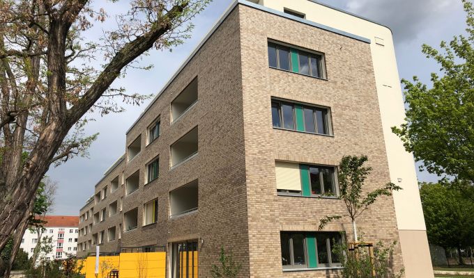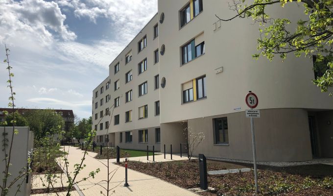 Bauherr: Bundesanstalt für ImmobilienaufgabenNeubau zweier Wohnhäuser (Vorder- und Hinterhaus) im Passivhausstandard in Dresden-Neustadt mit 14 Wohnungen, einem Gemeinschaftsraum, zwei Gästezimmern, einer Werkstatt, einer Tiefgarage und einem begrünten Innenhof. Die Gebäudehülle wurde entsprechend gedämmt, nahezu wärmebrückenfrei und luftdicht ausgeführt, eine kontrollierte Wohnraumlüftung mit Wärmerückgewinnung und eine solarthermische Anlage installiert.