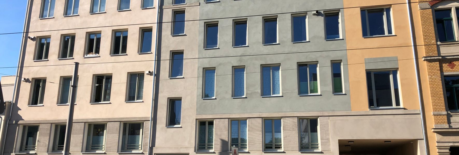 Bauherr: Bundesanstalt für ImmobilienaufgabenNeubau zweier Wohnhäuser (Vorder- und Hinterhaus) im Passivhausstandard in Dresden-Neustadt mit 14 Wohnungen, einem Gemeinschaftsraum, zwei Gästezimmern, einer Werkstatt, einer Tiefgarage und einem begrünten Innenhof. Die Gebäudehülle wurde entsprechend gedämmt, nahezu wärmebrückenfrei und luftdicht ausgeführt, eine kontrollierte Wohnraumlüftung mit Wärmerückgewinnung und eine solarthermische Anlage installiert.